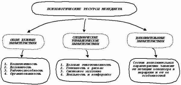 1. Психологические ресурсы менеджера включают систему психологических характеристик (качеств личности), которые устойчиво проявляются не только в стиле поведения руководителя в процессе делового общения, но и в стиле его мышления, в индивидуальных особенностях принятия и реализации решений, поиска управленческих схем и др.