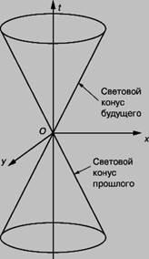 = 0, образуют конус прошлого (нижний конус на рис. 6). Он выглядит точно так же, как конус будущего, но обращен назад. Вместе конусы прошлого и будущего образуют двойной конус с вершиной в пространственно-временной точке O