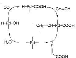 . Очевидно, что палладий в разных степенях окисления будет способен участвовать в разных по природе стадиях механизма. Например, Pd(II) – окислитель, акцептор пар электронов, мягкая апротонная кислота, а Pd(0) – восстановитель, донор пар электронов, мягкое основание. Так, механизмы одной и той же реакции алкоксикарбонилирования ацетилена с образованием акрилата (А) на этих двух частицах в спиртовых растворах принципиально различны: