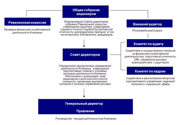 Высшим органом управления ОАО «Газпром нефть» является Общее собрание акционеров, в функции которого входит формирование Совета директоров, избрание Ревизионной комиссии, утверждение аудитора, утверждение годового отчета и годовой бухгалтерской отчетности, распределение прибыли, в том числе выплата (объявление) дивидендов. В настоящее время аудитором Компании является PricewaterhouseCoopers. В дополнение к внешнему аудиту, контроль за финансово-хозяйственной деятельностью Компании на предмет соответствия действующему законодательству, Уставу и внутренним документам Компании осуществляет Ревизионная комиссия.