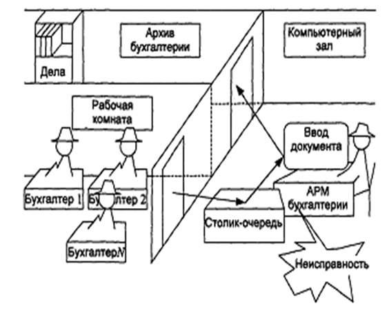 В качестве неисправности будем рассматривать любое собыгие, приводящее компьютер в нерабочее состояние в течение рабочего дня: выход из строя микросхемы, необходимость замены картриджа в печатающем устройстве, неисправность монитора, клавиатуры и ряд других. В любом случае после возникновения неисправности обработка документа с номером к прерывается, после чего вместо оператора за компьютером находится наладчик, который в течение какого-то интервала времени приводит компьютер в рабочее состояние. После ремонта компьютера оператор продолжает обработку документа с номером к (полагаем, что программное обеспечение позволяет не начинать обработку документа заново).