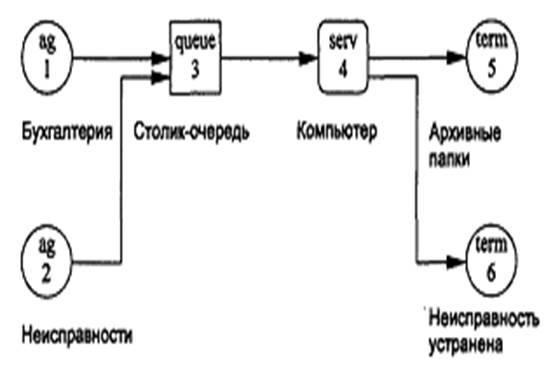 Каждый бухгалтерский документ, исходящий из рабочей комнаты, будем считать неприоритетным транзактом. Тогда все бухгалтеры - это один генератор транзактов бесконечной емкости (узел 1 модели ag).
