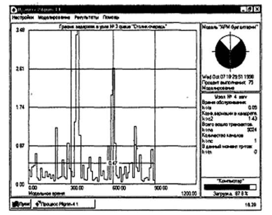 В процессе моделирования в стандартном окне на экране монитора можно наблюдать динамику задержек, пространственных процессов, потоков транзактов, а также информацию о любом узле, входящем в состав модели. Результаты моделирования показаны на рис. 3 (график задержек) и в табл. 1, получаемой с помощью компьютера.