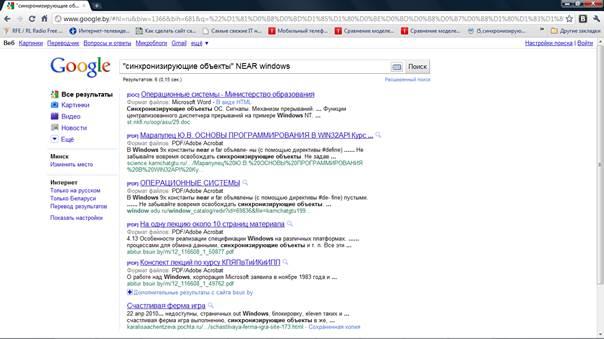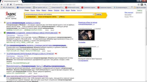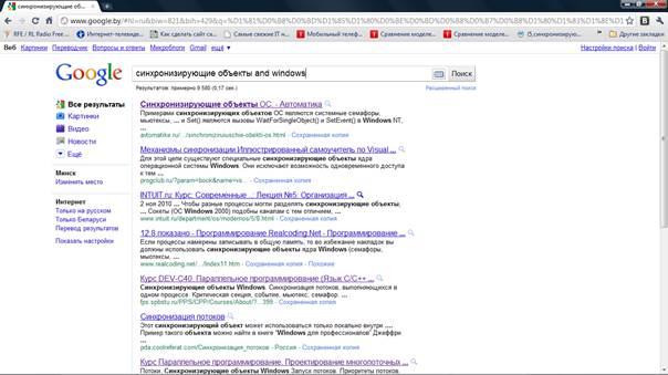 Проводился поиск по теме «Синхронизирующие объекты ОС Windows». Использовались поисковые системы Google, Rambler ,Yahoo, Yandex.