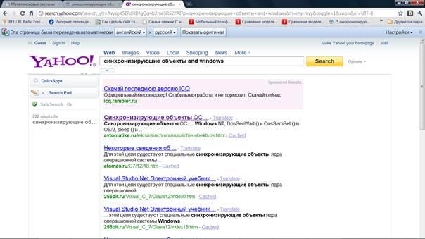 Вначале был создан простой запрос «синхронизирующие объекты and windows». На рисунках 1,2,3,4 приведены результаты поиска в различных поисковых системах: