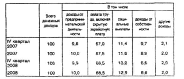 В структуре денежных доходов населения в IV квартале 2008 г. по сравнению с соответствующим периодом 2007 г. возросли доли оплаты труда, социальных выплат и доходов от предпринимательской деятельности при снижении доли доходов от собственности. По итогам 2008 г. сложилась следующая структура денежных доходов населения: 68,5% доходов приходилось на оплату труда, 12,9% - на социальные выплаты, 10,0% - на доходы от предпринимательской деятельности, 2,6% - на доходы от собственности, 2,0% - на прочие виды доходов. За год структура денежных доходов населения практически не изменилась.