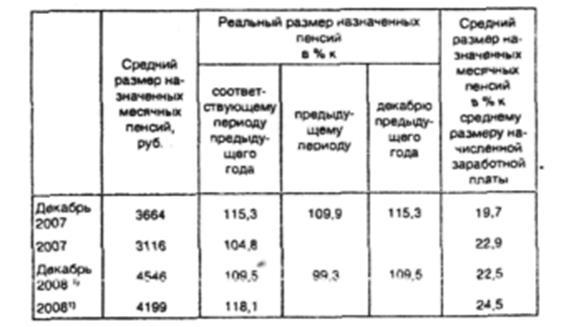 За 2008 г. в целом средний размер назначенных месячных пенсий увеличился на 34,8% и достиг 4199 руб. Реальный размер назначенных пенсий за год вырос на 18,1% против 4,8% в 2007 г. относительно предшествующего 2006 г. Соотношение среднего размера назначенных месячных пенсий относительно среднего размера начисленной заработной платы в 2008 г. вышло на уровень 24,5%, что выше уровня 2007 г. на 1,6 процентный пункт. Все это свидетельствует пусть о медленном, но все же продвижении на пути повышения уровня жизни пенсионеров.