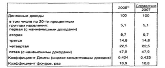 В 2008 г. произошло дальнейшее расслоение населения по уровню получаемых денежных доходов. Об этом свидетельствуют возросшие коэффициент фондов и коэффициент Джини. Кроме того, в прошедшем году, по предварительным данным, на долю 10% наиболее обеспеченного населения приходилось 31,2% общего объема денежных доходов (в 2007 г. – 31,1%), а на долю 10% наименее обеспеченного населения – 1,8% (1,8%).