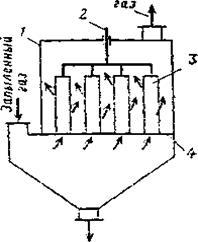 Схема трубчатого электрофильтра представлена на рисунке 5. Запыленный газ движется по вертикальным трубам диаметром 200—250 мм. Пыль оседает на внутренней поверхности труб. При помощи встряхивающего устройства ее удаляют в бункер.
