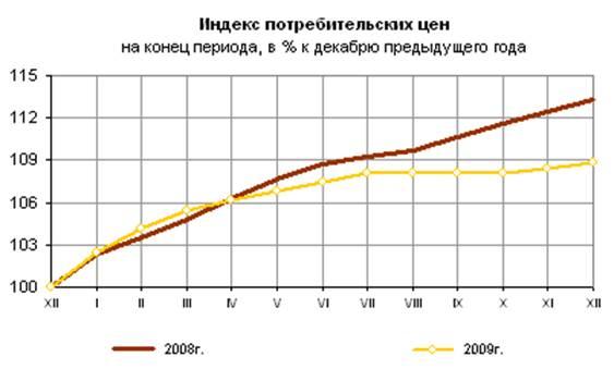 Если в первой половине 2009 года инфляция стабильно росла, то во второй половине рост почти совсем остановился, в то время как кривая инфляции за 2008 год ушла вверх. Таким образом, уровень инфляции в России заметно снижается