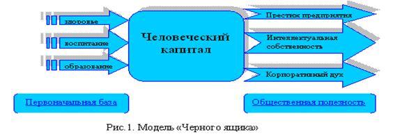 Первая модель, модель «черного ящика» (рис. 1.), показывает сущность человеческого капитала, а именно значимость его для предприятия. В качестве входных параметров выступают образование, воспитание, здоровье, то есть та база, которая делает человека объектом воплощения капитала, а на выходе мы получаем определенную общественную полезность, то есть ту выгоду, которую приносит человеческий капитал предприятию. Она может быть выражена как в материальном показателе (определенный процент прибыли, рост различных финансовых показателей), так и в нематериальном (престиж предприятия, корпоративный дух, интеллектуальная собственность).