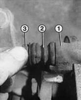 После снятия стопора направляющего болта (1) суппорта тормозного механизма (3), снимите суппорт (2) с присоединенным шлангом, что позволит легко демонтировать тормозные колодки. Если снят только нижний стопорный болт, то можно поднять тормозной суппорт, что позволит легко заменить любую колодку.