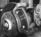 Обратите внимание на то, чтобы тормозной шланг не был натянут и перекручен. Подвесьте суппорт тормозного механизма с помощью проволоки в колесной арке.