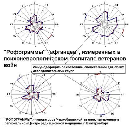 На представленных диаграммах (“рофограммах”) отражены ярко выраженные особенности рисунков, характерные для нескольких групп исследуемых лиц ( своеобразный “трилистник”) - см. рисунок 1 : “чернобыльцы” ,“афганцы”.