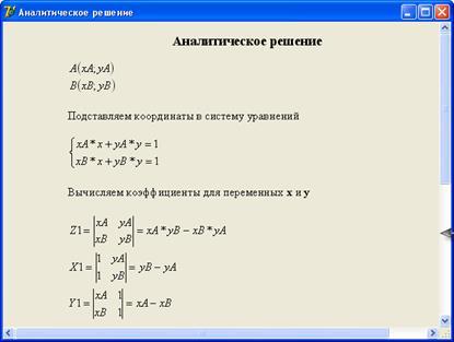 1. Тема проекту «Розробка засобами Delphi дидактичного ілюстративного матеріалу для розв’язання задачі з аналітичної геометрії. Знаходження точки перетину прямої з віссю координат, якщо ця пряма проходить через введені точки»