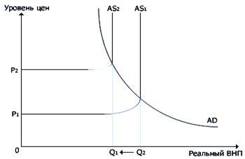 а) Инфляция издержек (инфляция предложения) - возникает в результате роста объема издержек, например, за счет сильного роста зарплаты, несоразмерного с ростом производительности труда. Как видно из нижеприведенных графиков, такой неблагоприятный шок предложения ведет к росту цен. Инфляция издержек может быть изображена графически (рис. 1). Смещение кривой совокупного предложения влево (АS1