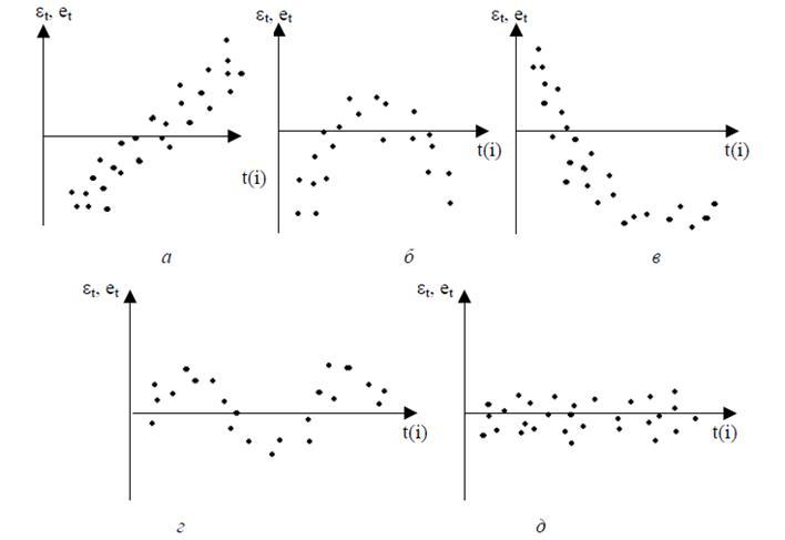 Естественно предположить, что на рис 2.1. а-г имеются определенные связи между отклонениями, т.е. автокорреляция имеет место. Отсутствие зависимости на рис. д