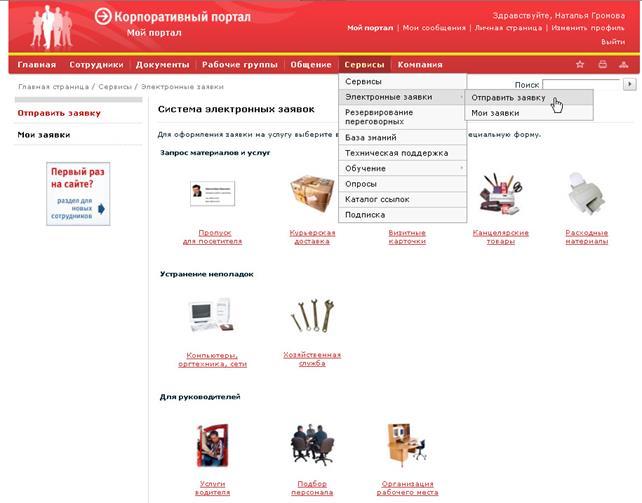 - Повышение эффективности бизнес-процессов: расширенный механизм подачи электронных заявок — пропуски, курьерская доставка, канцтовары, бронирование переговорных, организация совещаний.