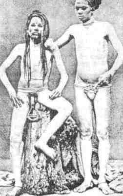 Редкий снимок, на котором изображен юноша из индийского племени Садху (слева) во время тренировки по удлинению своего члена. Обратите внимание на груз овальной формы, свисающий с его пениса. К тому времени, когда он станет взрослым мужчиной, длина его члена достигнет 46 см