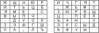 Рис. 1. Две таблицы со случайно расположенными символами русского алфавита для шифра "двойной квадрат"