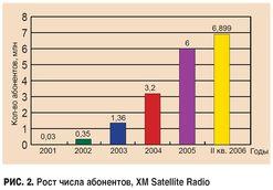 В настоящее время в мире действует четыре спутниковые системы непосредственного звукового вещания. Две системы предоставляют услуги в США и Канаде, это Sirius Satellite Radio и ХМ Satellite Radio. Первая система использует низкоорбитальную группировку, состоящую из трех спутников, и распространяет около 130 цифровых звуковых каналов. Вторая состоит из двух геостационарных спутников, вещает около 150 каналов и осуществляет передачу информации о ситуации на дорогах, о пробках, авариях, что позволяет корректировать в режиме реального времени работу навигационных систем автомобилей. Помимо этого существует специальная подписка для абонентов сети сотовой связи, которые могут принимать 20 звуковых программ и загружать файлы в формате MP3. Обе сети используют наземные ретрансляционные сети, состоящие из маломощных наземных передатчиков для обеспечения уверенного приема в условиях городской застройки. Несмотря на специфику американского рынка, темпы проникновения услуг спутникового звукового радио заслуживают особого анализа (рис. 2) [6]. Только в 2005 г. было продано 2,5 млн автомобильных приемников. Практически все дилеры крупных автомобильных компаний на американском рынке включили спутниковый радиоприемник в базовую комплектацию машин и имеют соглашения со спутниковыми операторами о включении абонентской платы в сумму погашения кредита для покупки автомобиля. С учетом того, что компании начали предоставлять услуги только в 2001 г., общее количество абонентов в США и Канаде в июне 2006 г. уже превысило 12 миллионов. Только во втором квартале 2006 г. Sirius стал обслуживать 600 000 новых абонентов. Оценка роста числа абонентов XM Satellite показала, что средний ежедневной прирост абонентов спутникового радио опережает темпы роста абонентов сотовой связи в начальные годы развития. На рынке услуг связи в США ни одна из технологий еще не имела таких высоких темпов проникновения.