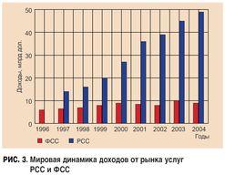 Оборот рынка от предоставления услуг ФСС в 2005 г. составил около 9,4 млрд долларов [1]. Развитие рынка в этой сфере связано в первую очередь с предоставлением услуг на зоновых сетях на основе VSAT-технологии, число таких станций в мире в конце 2004 г. составило около 1 млн [2]. Новым направлением развития ФСС стало в 2005 г. появление на рынках услуг связи США, Канады и Юго-Восточной Азии спутниковых операторов, предлагающих широкополосный абонентский доступ. В июне 2005 г. в США уже 377 291 абонентов пользовались этими услугами [11].