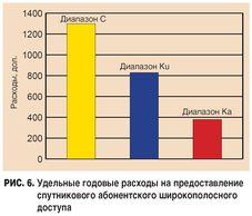 Постепенно происходит процесс перехода местных сетей к широкополосному абонентскому доступу [15]. В течение недавнего времени был разработан ряд технологий, направленных на решение данной проблемы (рис. 5). Технико-экономические исследования показали, что удельные расходы на предоставление аналогичных услуг c использованием спутника в С- и Кu-диапазонах в несколько раз выше, чем при использовании наземных систем, что прежде всего связано со стоимостью космического сегмента и абонентского оборудования (рис. 6) [16]. Снижения стоимости можно добиться за счет создания широкополосных спутников, обеспечивающих емкость не менее 20 Гбит/с в Ка-диапазоне. Это требует использования обработки на борту, повышения мощности солнечных батарей, увеличения усиления антенн за счет применения узких перенацеливаемых лучей и, наконец, использования широких полос частот. Европейское космическое агентство уверено, что в ближайшем будущем будет возможно производить спутники, обеспечивающие суммарную емкость до 120 Гбит/с.