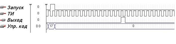 На рисунке 4 приведён результат моделирования работы таймера. Для примера на устройство был подан код числа 17. Как видно из графика, управляющий код записывается по фронту импульса «запуск» и спустя 17 тактовых импульсов после запуска, схема выдаёт импульс длительностью 5*10-7