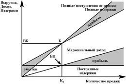 . В этой точке наступает равенство постоянных затрат и маржинального дохода. В обоих случаях за пределами точек безубыточности предприятие получает прибыль (доход), причем одну и ту же.