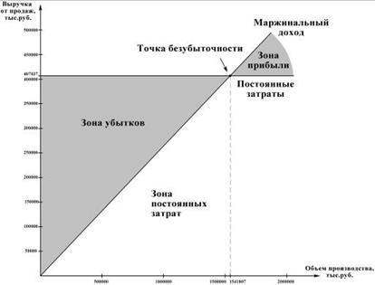 Для расчета безубыточного объема производства по отдельным видам продукции в экономической литературе применяется показатель маржинального дохода (прибыли), рассчитанного по прямым затратам на производство данного вида продукции. Объем производства по отдельному виду продукции считается безубыточным, если выручка от реализации покрывает переменные и прямые постоянные затраты на производство данного вида продукции. Однако, поскольку маржинальный доход формируется не только в основной деятельности промышленных предприятий, безубыточный объем продаж необходимо рассчитывать для всех объектов маржинального дохода.