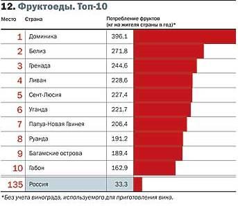С потреблением фруктов в России дела обстоят совсем плохо — 135-е место в мире. Правда, это все-таки лучше, чем достижения Белоруссии, Боснии и Герцеговины и Украины. Первая десятка стран-потребителей фруктов выглядит очень экзотично. Честно говоря, трудно понять, как гражданин государства Содружество Доминики (оно мировой лидер в данной категории) умудряется «слопать» 396 кг фруктов в год и ест ли он при этом что-то еще. Впрочем, возможно, что он использует бананы, к примеру, для изготовления самогона. (См. таб.1.)