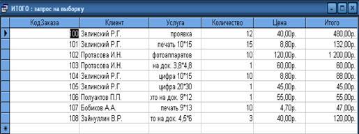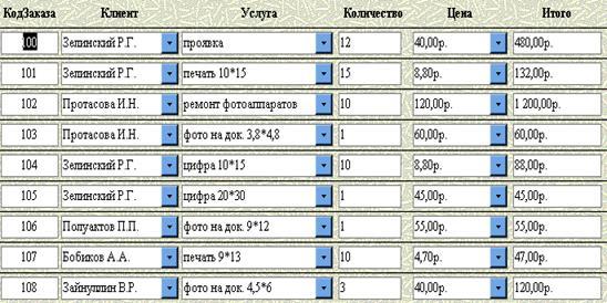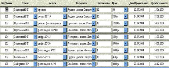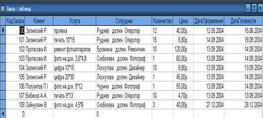В таблице содержится полная информация о заказе (код заказа, ФИО клиента, наименование услуги, фамилия сотрудника, количество, цена за данный вид услуги, дата оформления и дата готовности)