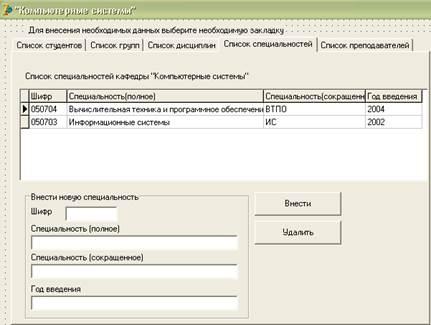 · ввод данных о дисциплинах, назначенных кафедрой, дисциплинах специализации, дисциплинах по выбору студента;