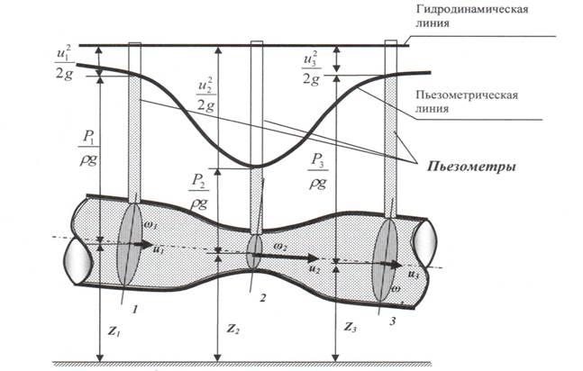 можно определить для каждого сечения элементарной струйки жидкости. Геометрическое тело точек, высоты которых равны называется пьезометрической линией