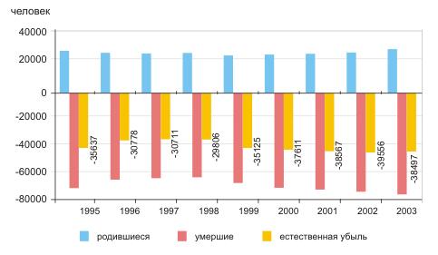 В 2003 году число умерших по сравнению с предыдущим годом увеличилось на 1798 человек (на 2.6%) и составило рекордную за весь послевоенный период величину - 69939 человек, в том числе в горпоселениях – 51280 (73.3%) и сельской местности – 18659 человек (26.7%). Из общего числа умерших в 2003 году 36877 человек - мужчины (52.7%) и 33062 - женщины (47.3%).