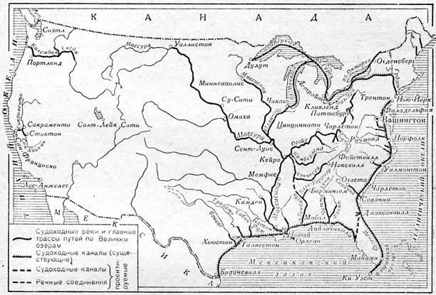 Разветвленная сеть внутреннего водного транспорта США состоит из системы рек, Великих озер, соединительных каналов и береговых каналов вдоль побережья Мексиканского залива и Атлантического океана. Почти весь бассейн р. Миссисипи судоходен круглый год, а Великие озера (Верхнее, Мичиган, Гурон, Эри и Онтарио) эксплуатируются 8-10 месяцев в году.