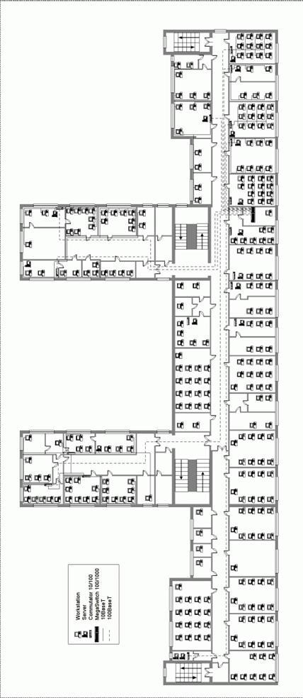 Рабочие места преподавателей, аспирантов и сотрудников кафедр в лабораториях, использующиеся для научных исследований, не предполагают большой средней нагрузки на сеть, т. к. они будут использоваться в основном для расчетов, обработки результатов экспериментов, запуска специальных приложений. Кроме того, пиковая нагрузка также будет гораздо меньше, чем в предыдущем случае, так как характер научных работ не предполагает массового обращения к одним и тем же данным в определенные часы, как это бывает в первые минуты занятий. Поэтому представляется целесообразным применение внутри подразделений 10-мегабитного Ethernet.