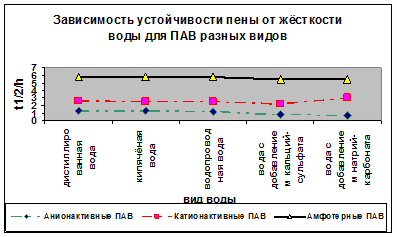 4. Для анионактивных и катионактивных ПАВ зависимость устойчивости пены от жёсткости воды выражено более сильно.