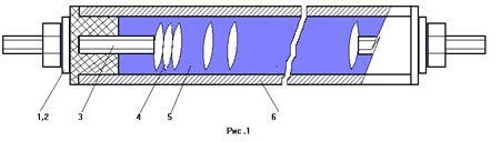 Рис.1 - 1 и 2 - контактное устройство; 3 - контактный стержень; 4- нагревательная спираль; 5 - накопитель (периклаз); 6 - оболочка (трубка) ТЭН;