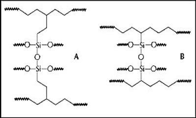 Применение силанов позволяет получить более гибкий и экономичный процесс сшивания. Технология влажной вулканизации Silquest® применяется в промышленности свыше 30 лет. Силано-сшитые полиолефины связаны Si-O-Si мостиками, (см. Рис. 1.3.1) в отличие от C--C связей, образующихся в результате пероксидного или радиационного метода.