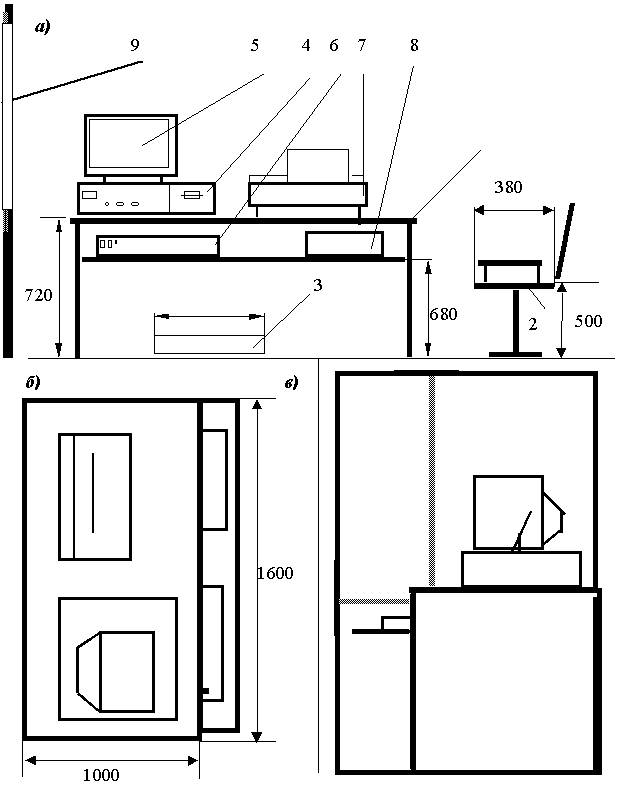 Рабочий стул программиста должен быть снабжен подъемно-поворотным механизмом. Высота сиденья должна регулироваться в пределах 400 - 500 мм. Глубина сиденья должна составлять не менее 380 мм, а ширина - не менее 400 мм. Высота опорной поверхности спинки не менее 300 мм, ширина - не менее 380 мм. Угол наклона спинки стула к плоскости сиденья должен изменяться в пределах 90 - 110 °. Схема рабочего места оператора приведена на рисунке 2. На рисунке цифрами обозначены: