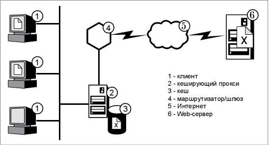 В большинстве случаев пересылающие прокси конфигурируются также для работы в качестве кэширующих прокси. Это явление используется настолько часто, что компания IBM включила это в название компонента своего Edge Server: IBM Caching Proxy. На рис. 1 отображен типичный пересылающий и кэширующий прокси-сервер.