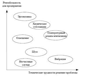 При проведении некоторых мероприятий по контролю важно отдавать отчет в том, насколько решение проблемы рентабельно с точки зрения предприятия. Однако четкого ответа на этот вопрос нет. Исследования показывают, что показали, что экономически выгодные решения технически относительно просты и рентабельны. В шведском исследовании сделана оценка рентабельности мероприятий по улучшению производственной среды и сложности их технических решений. Как показывают результаты, улучшение эргономики оказалось технически простым делом и экономически выгодным. Устранение химической опасности и улучшение вентиляции также являются экономически выгодными мероприятиями. В то же время, работы по снижению травматизма, шума и вибрации экономически не так выгодны (рис. 1.2). Борьба с травматизмом оказалась экономически не рентабельной частично из-за тогдашнего страхового законодательства Швеции, в соответствии с которым большую часть расходов по возмещению вреда, полученного в результате несчастного случая, несёт общество.