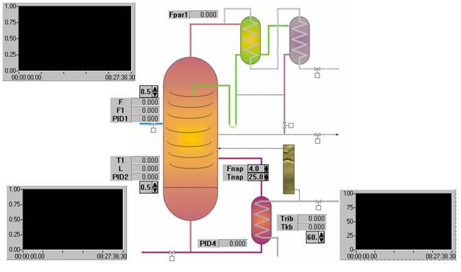 Блок SCR2: здесь формируются значения тепературы жидкости на входе колонны, значение тепературы рибойлера и расхода кубовой жидкости, индикация текущего уровня жидкости в кубовой секции, его сигнализация при аварийной ситуации, расход газа и кубовой жидкости, тепература кубовой жидкости, а также качество смеси. Индикация выводится в окнах DISPLAY1 в блоке NumericString.
