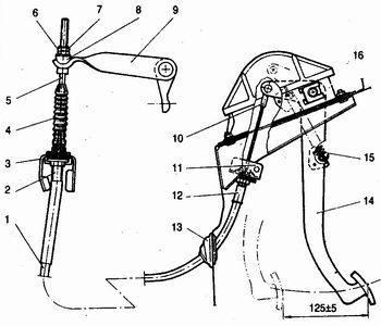 Рис. 2. Привод сцепления: 1 - оболочка троса; 2 - нижний наконечник оболочки троса; 3 - кронштейн крепления троса; 4 - защитный чехол троса; 5 - нижний наконечник троса; 6 - регулировочная гайка; 7 - контргайка; 8 - поводок троса; 9 - вилка выключения сцепления; 10 - верхний наконечник троса; 11 - упорная пластина; 12 - верхний наконечник оболочки троса; 13 - уплотнитель; 14 - педаль сцепления; 15 - пружина педали сцепления; 16 - кронштейн педали сцепления