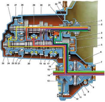 18 – ведомая шестерня II передачи вторичного вала; 19 – ведомая шестерня III передачи вторичного вала; 20 – синхронизатор III и IV передач; 21 – ведомая шестерня IV передачи вторичного вала; 22 – шариковый подшипник вторичного вала; 23 – ведомая шестерня V передачи вторичного вала; 24 – синхронизатор V передачи; 25 – вторичный вал; 26 – задняя крышка картера коробки передач; 27 – ведущая шестерня V передачи; 28 – шариковый подшипник первичного вала; 29 – первичный вал; 30 – картер коробки передач; 31 – роликовый подшипник первичного вала; 32 – сальник первичного вала; 33 – сапун |