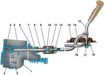 11 – наконечник шарнира; 12 – хомут; 13 – защитный чехол тяги; 14 – тяга привода управления коробки передач; 15 – рычаг переключения передач; 16 – обойма шаровой опоры; 17 – шаровая опора рычага переключения передач; 18 – реактивная тяга |