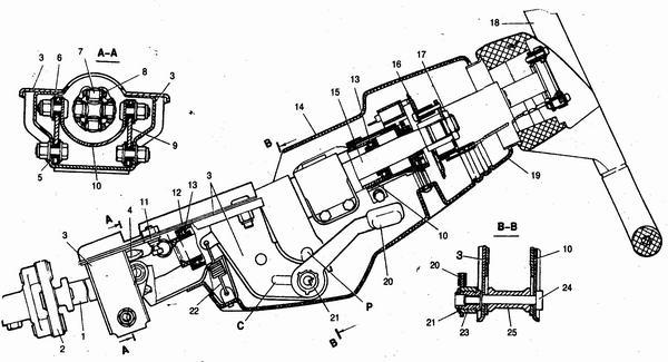 1 – рычаг штока выбора передач; 2 – рычаг выбора передач; 3 – картер коробки передач; 4 – картер сцепления; 5 – шток выбора передач; 6 – втулка штока; 7 – сальник штока; 8 – защитный чехол; 9 – корпус шарнира; 10 – втулка шарнира;