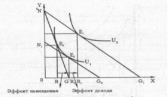 Нисходящую форму кривой спроса можно объяснить не только базируясь на теории предельной полезности. Так называемый эффект дохода состоит в том, что если цена на какой-либо товар снижается, то у потребителя высвобождается часть дохода для покупки дополнительных единиц данного или какого-либо другого товара. Падение цены даже одного товара оказывает влияние, пусть незначительное, на общий уровень цен и делает потребителей относительно богаче. Согласно эффекту замещения потребитель будет покупать больше продукции, цена которой снизилась, и заменять ею другие товары, которые при этом относительно подорожали. Например, снижение цены на куры заставит нас покупать больше кур по сравнению с говядиной или свининой. Допустим, что в результате снижения цен на благо Х положение равновесия потребителя переместилось из точки Е0 в точку Е1 (прилож.Б). Чтобы выявить эффект дохода, необходимо провести линию бюджетного ограничения N1G2, параллельную линии бюджетного ограничения NG1, так, чтобы она касалась первоначальной кривой безразличия U1. Обозначим точку касания бюджетной линии N1G2 с кривой безразличия U1 через Е2. Величина проекции отрезка кривой безразличия Е0Е2 на ось абсцисс объясняется исключительно изменением относительных цен благ и называется эффектом замещения.