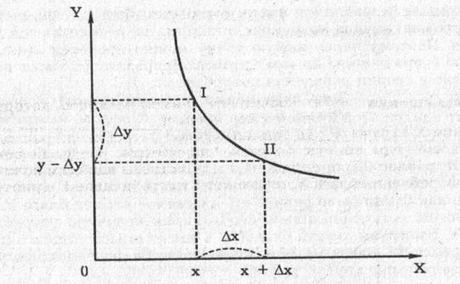 Наклон в каждой точке кривой безразличия отражает пропорцию, в которой потребитель готов заменить один товар другим, или предельную норму замещения. Предельная норма замещения — количество, на которое потребление одного из двух благ должно быть увеличено (или уменьшено), чтобы полностью компенсировать потребителю уменьшение (или увеличение) потребления другого блага на одну дополнительную единицу (прилож.Д). Если на оси абсцисс мы отложим количество единиц блага Х, а на оси ординат — количество единиц блага У, то отношение — dY/dX характеризует предельную норму замещения У на Х. Допустим, что при замещении 2-х кг сыра 4-мя кг мяса, потребитель получает одинаковое удовлетворение потребностей.